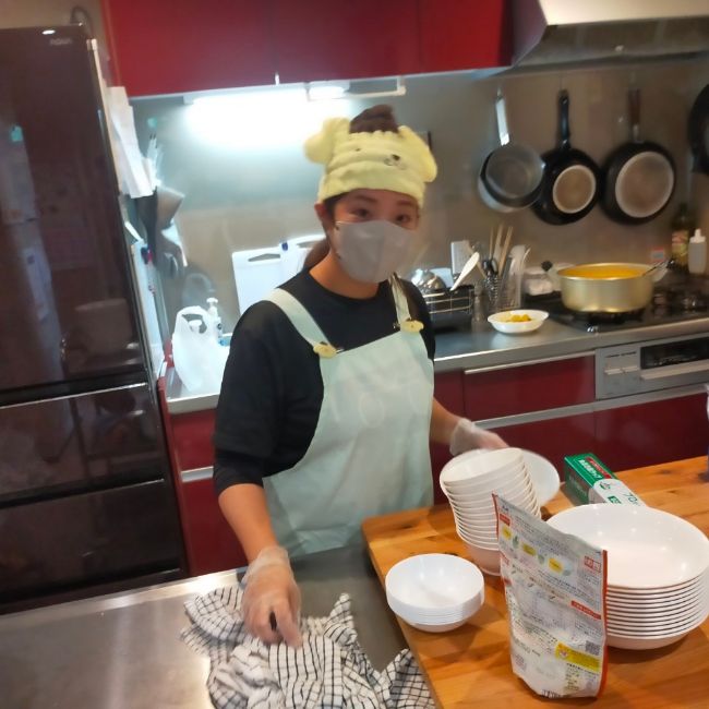 1時間ゆっくりランチタイム。手作りの美味しいご飯をいただきます!休憩スペースのテーブルにはアクリル板を設置してありコロナ対策もバッチリです。